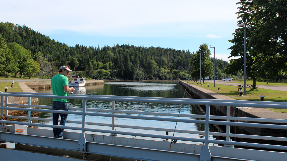 It was our luck to have an experienced fisherman help us get some of our own seafood. John’s spot to catch squid was at a canal that connects the Bras d’Or Lake with the ocean. The squid are caught with a special type of oval lure that hangs down and has barbs pointing up from the bottom. You just drop it to the bottom, reel up a few cranks, then “jig it” up and down. If you do it right, a tempted squid will grab a hold of the lure with their tentacles. When you feel the weight of a squid, you reel in, maintaining constant pressure.